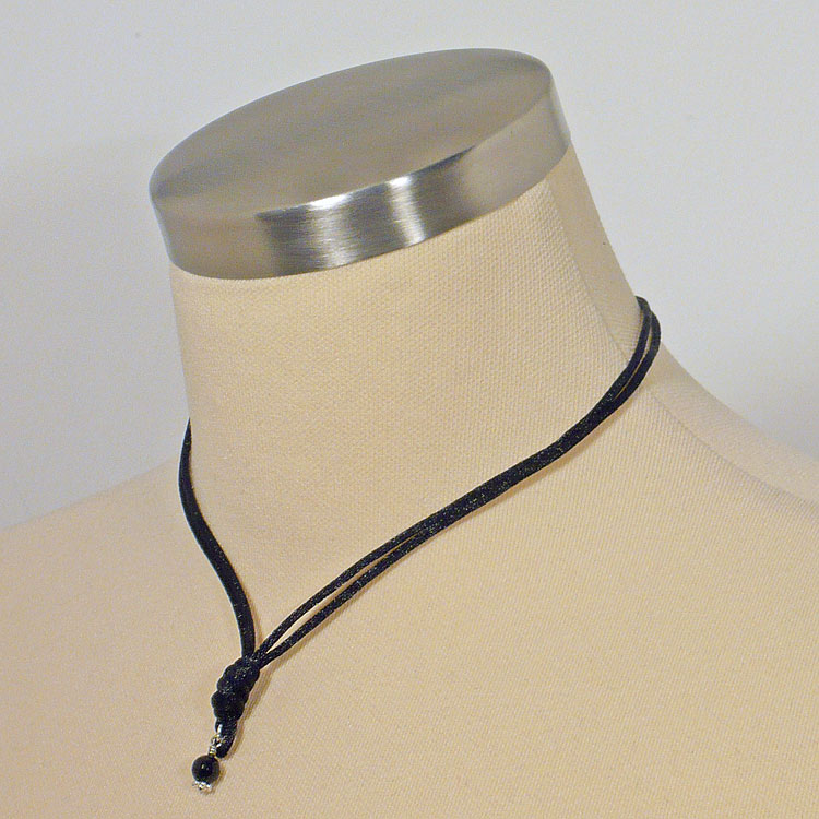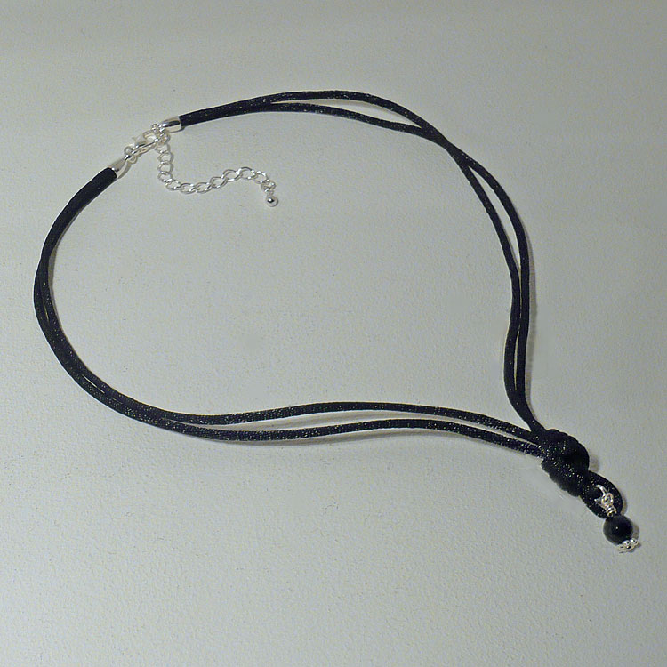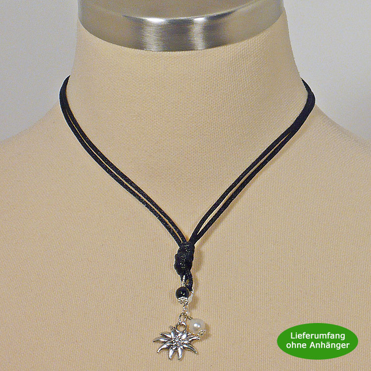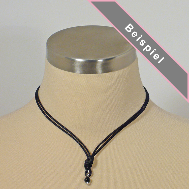 Die Fotos zeigen nur ein mögliches Beispiel und zwar mit schwarzer Satinkordel. Die Satinkordel ist aber in vielen Farben erhältlich.