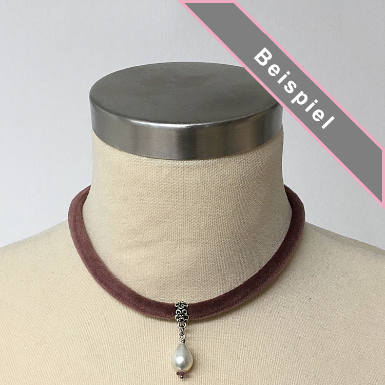 Die Fotos zeigen nur ein mögliches Beispiel und zwar mit altrosafarbenem Samt. Die weiche Samtkordel gibt es in den fünf Farben Altrosa, Pink, Dunkelrot, Olivgrün und Grau.