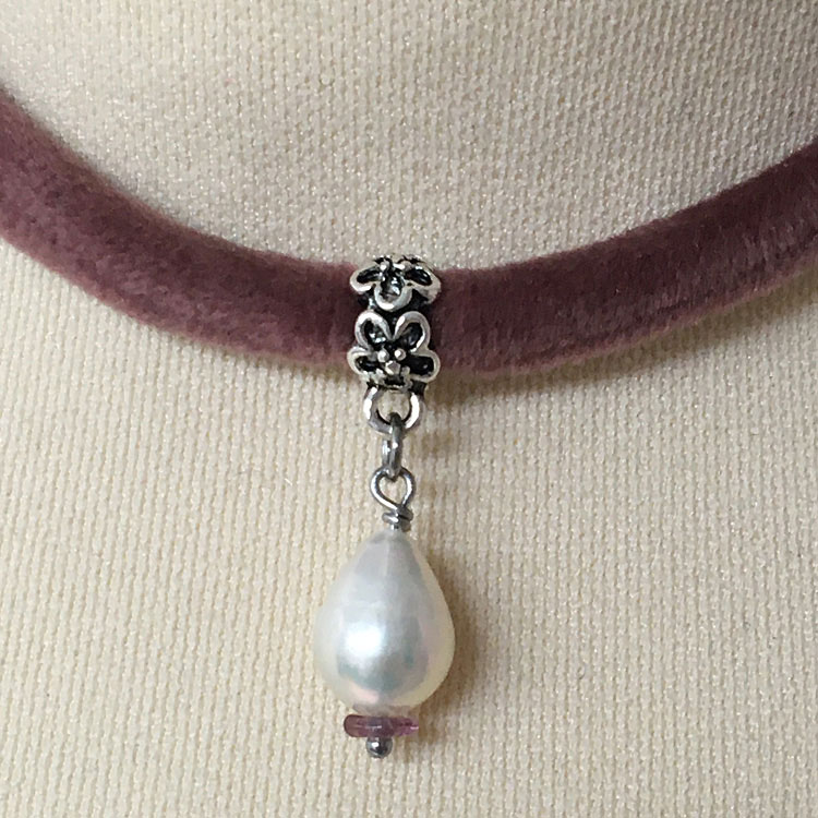 Kette, aus Samt mit Süßwasserperlen-Anhänger und kleiner Glasblüte