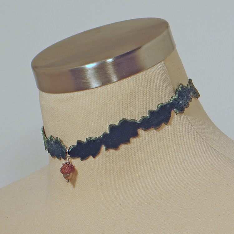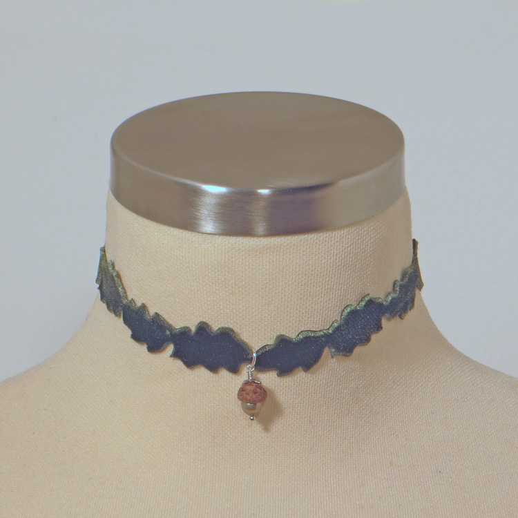 Hier steht Autentizität wirklich ganz weit oben, denn beim olivgrünen Samtband des Chokers reihen sich hübsch gearbeiteten Eichenblätter aneinander.