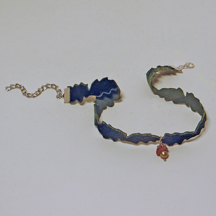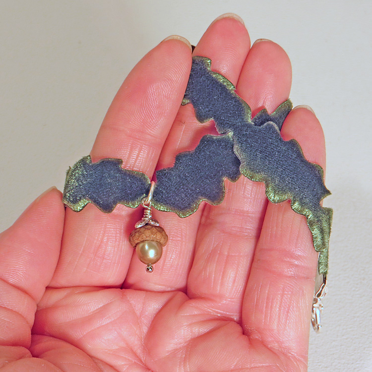 - Komponenten und Materialien: Samtband (in Eichenblattform, olivgrün; ca. 15mm breit), echte Eichelkappe*, Süßwasserperle* (grünlich-goldfarben), Verbindungselemente und Verschluss aus Metall (z.T. versilbert)