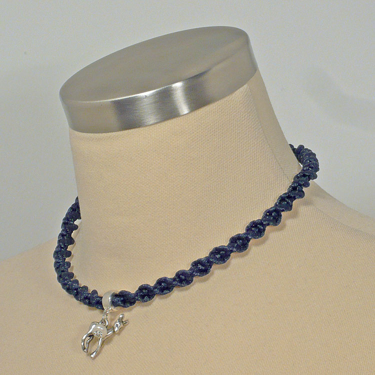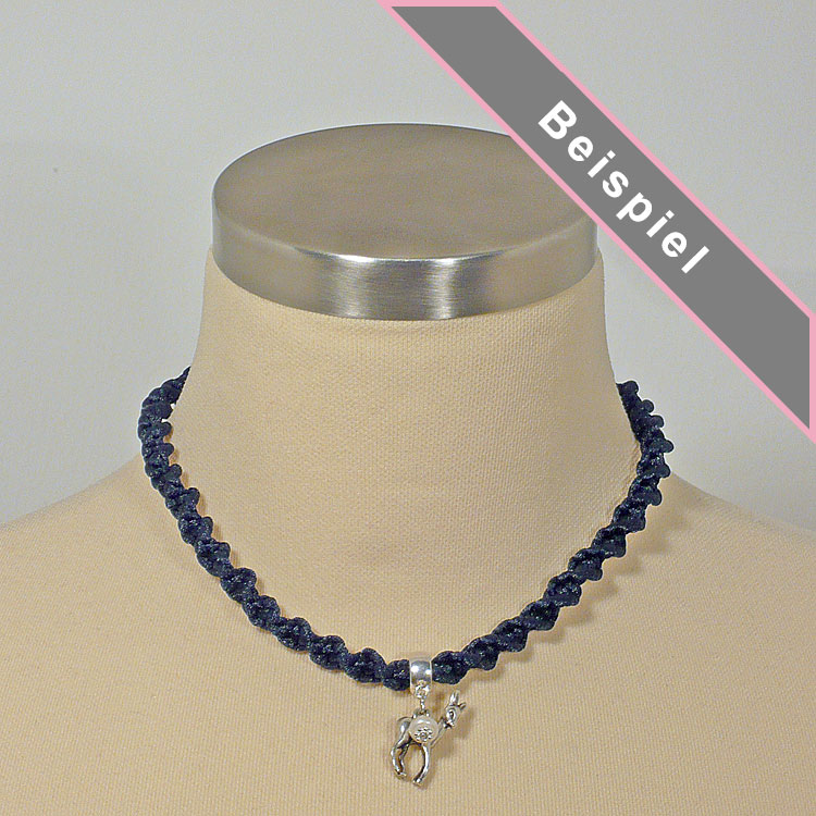 Die Kette wird aufwendig von Hand spiralförmig geknüpft. Sie wird sehr fest geknüpft, so dass sie sich fast reifartig, wie ein Collier, um den Hals legt.