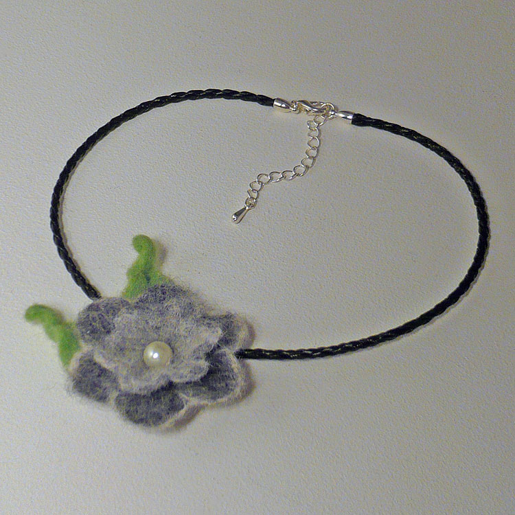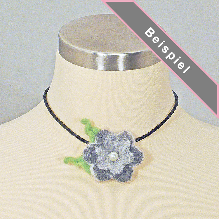 Die Fotos zeigen nur ein mögliches Beispiel und zwar mit schwarzer Kunstlederkordel und einer dunkelgrau melierten Filzblüte mit apfelgrünen Blättern.