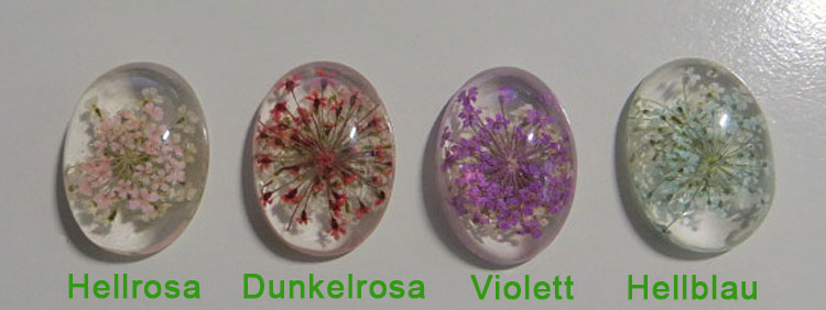 vier Farben zur Wahl. Das Foto mit den Blüten-Medaillons zeigt von links nach rechts die zur Wahl stehenden Farben Hellrosa, Dunkelrosa, Violett und Hellblau.