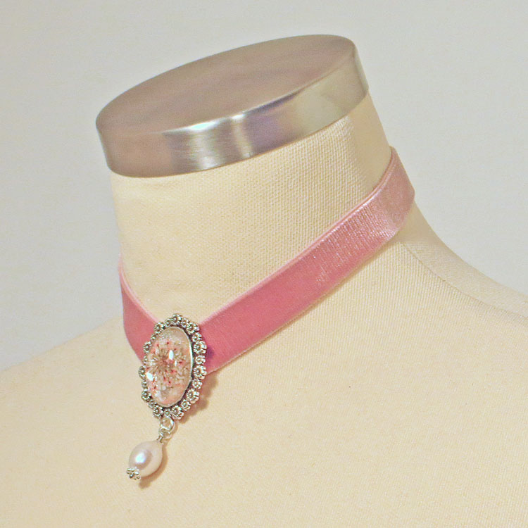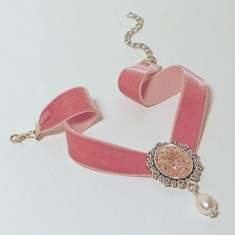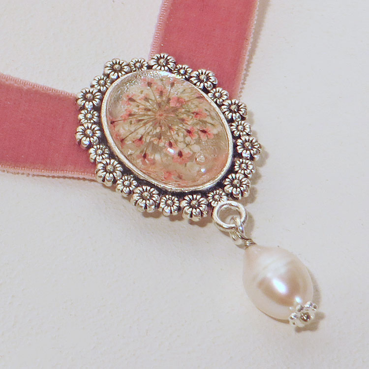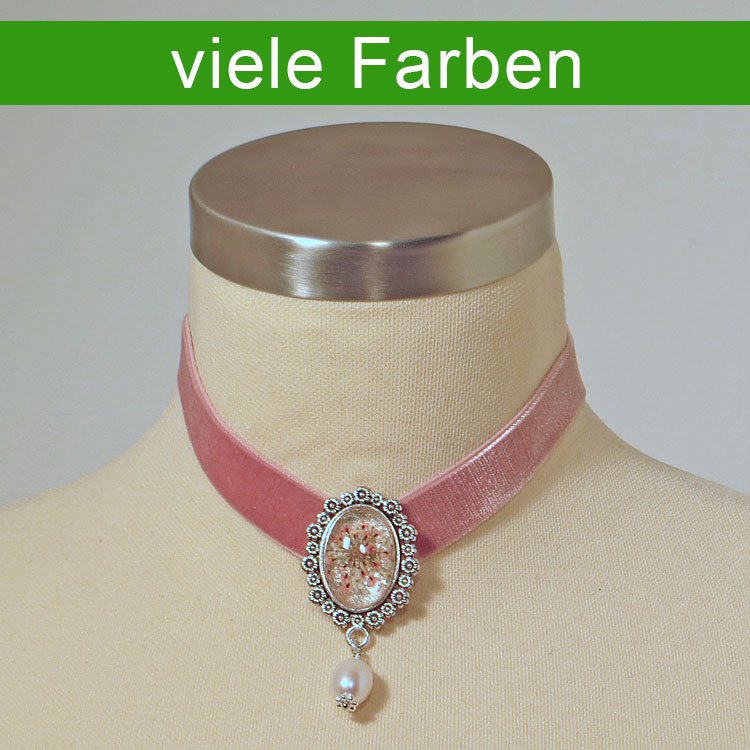 Die halsnahe Samtkette wird die Blicke auf sich ziehen: Am breiten Samtband befindet sich ein hübsches Medaillon mit echten, getrockneten Blüten, an dem sich eine edle, stattlich große Süßwasserperle in Tropfenform befindet.