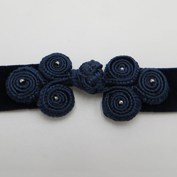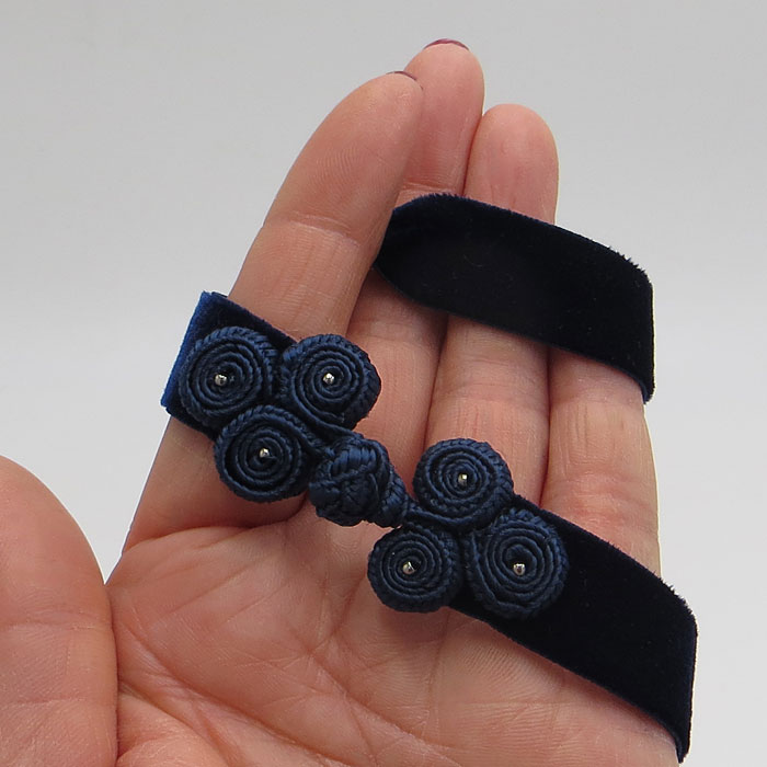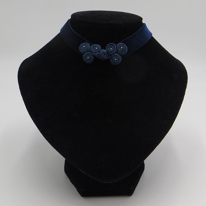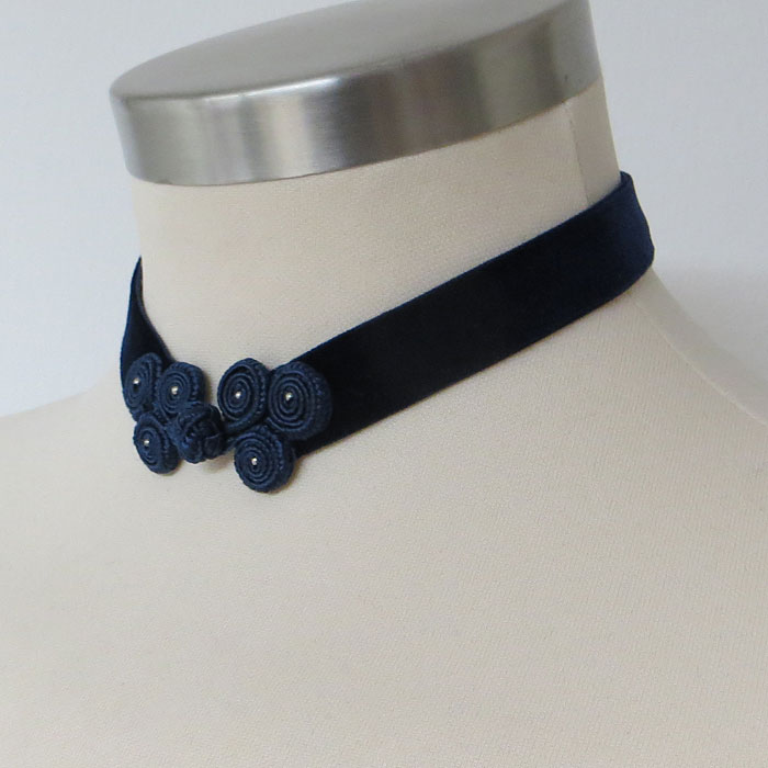 Die Kropfband-Kette aus Samt ziert ein effektvoll geknotetes Deko-Element, das an einen Verschluss erinnert. Es ist mit kleinen Perlchen bestickt und fest vernäht, so dass hier nichts aufgehen kann.