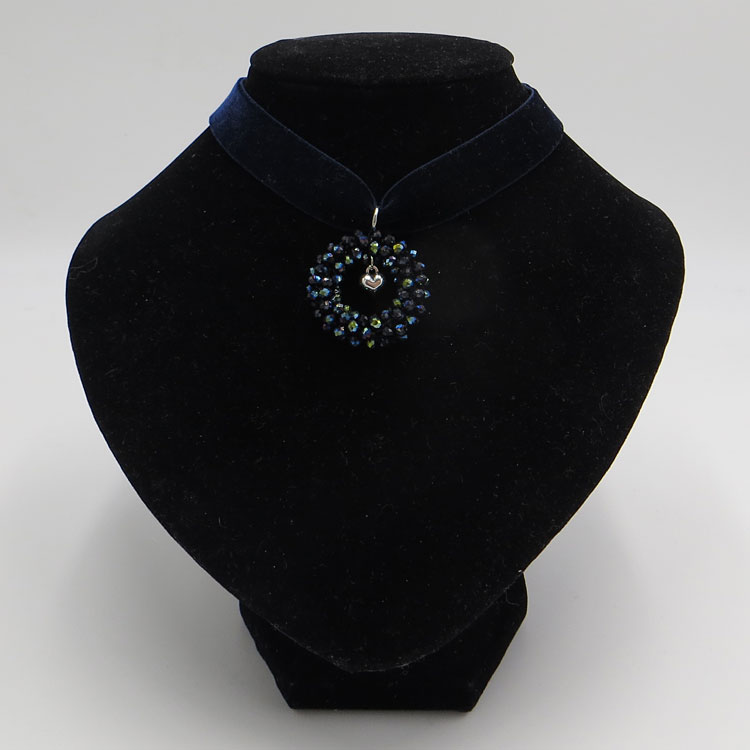 Die halsnahe Kette aus Samt ziert ein dekorativer Perlenkringel, der sich aus vielen kleinen Glasperlen zusammengesetzt. Die Perlen sind facettiett und schillern daher besonders schön in Blau-Grün oder edlem Weiß. Mittig im Kringel befindet sich noch ein plastisch gearbeitetes, kleines Herzchen.