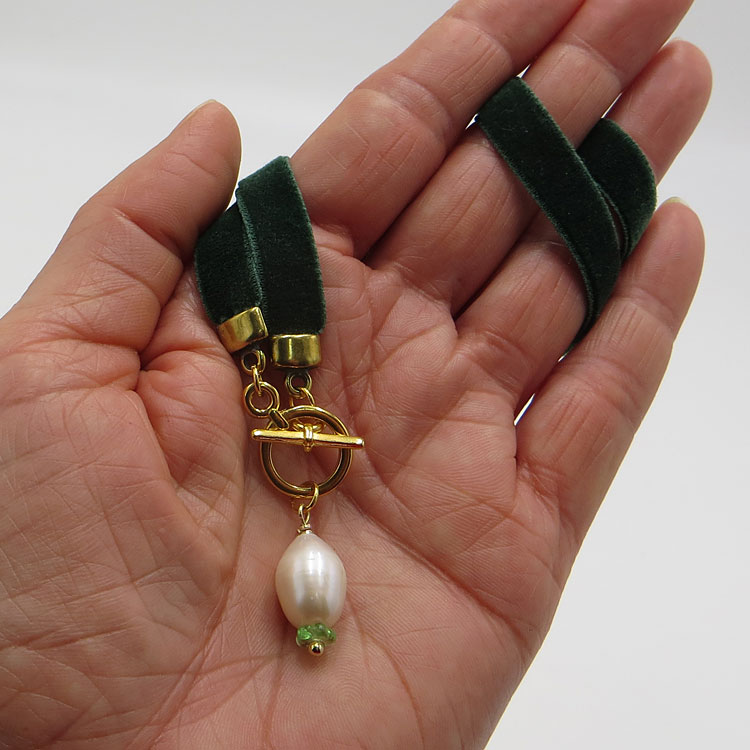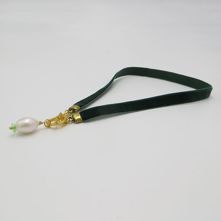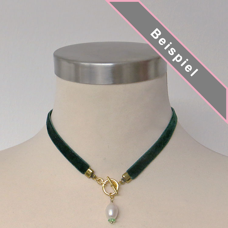 - Komponenten und Materialien: Samtband (ca. 10mm, je nach Farbwahl in elastischer bzw. nicht elastischer Bandqualität), Süßwasserperle*, Glasblüte, Stab-Ring-Verschluss/ Vorderverschluss aus Metall (vergoldet)