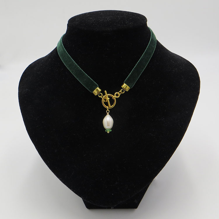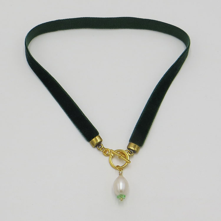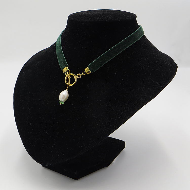 halsnahe Kette, Samtband (schmälere Variante mit 10mm), Vorderverschluss (vergoldet) mit Süßwasserperlen-Tropfen