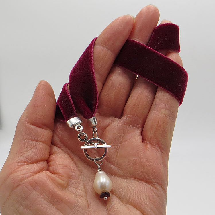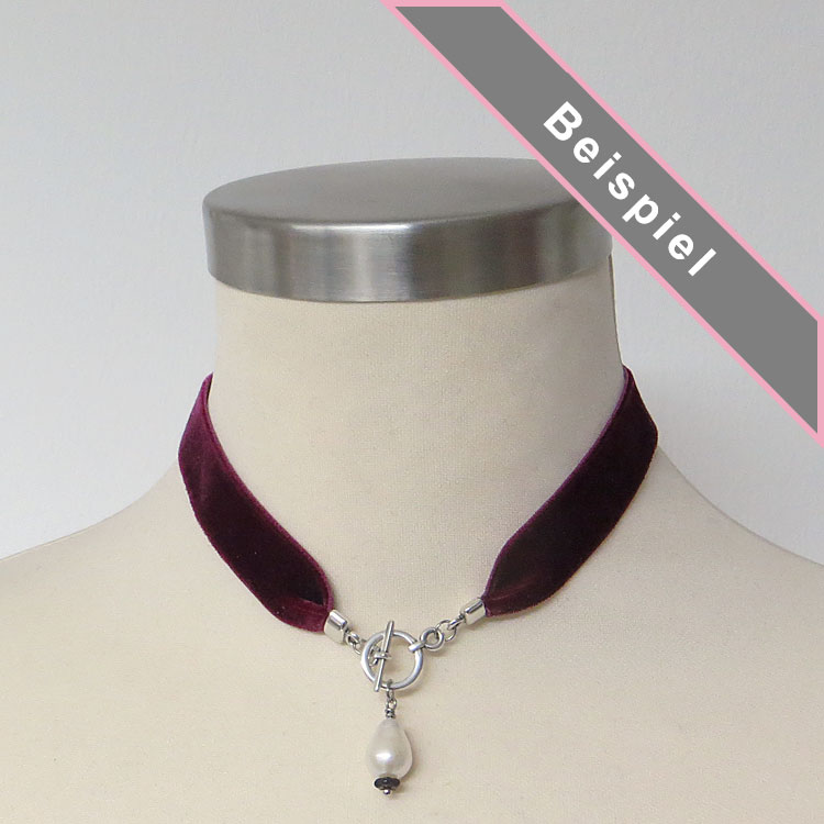 - Komponenten und Materialien: Samtband (ca. 15mm, je nach Farbwahl in elastischer bzw. nicht elastischer Bandqualität), Süßwasserperle*, Glasblüte, Stab-Ring-Verschluss/ Vorderverschluss aus Metall (versilbert)