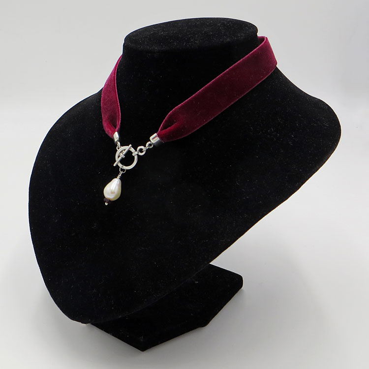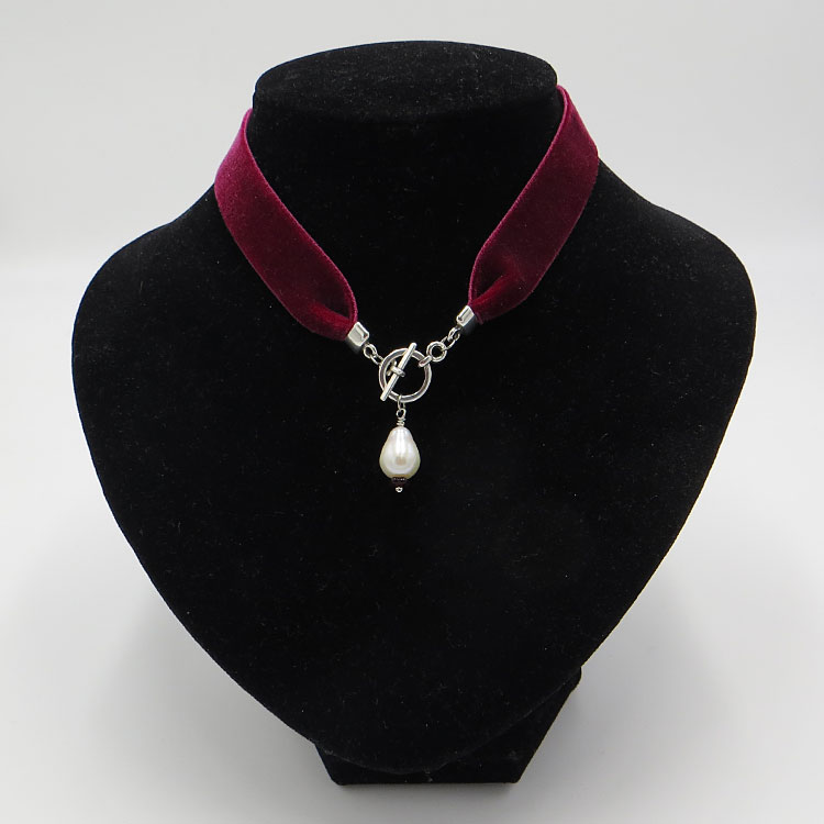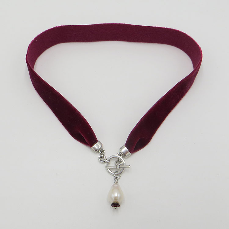 halsnahe Kette, Samtband (breitere Variante mit 15mm), Vorderverschluss mit Süßwasserperlen-Tropfen