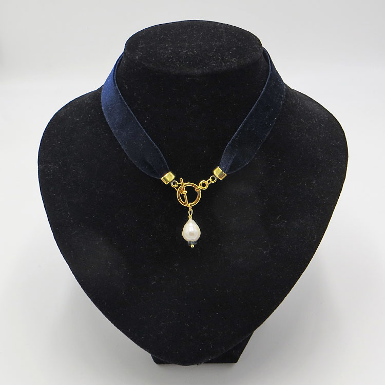 halsnahe Kette, Samtband (breitere Variante mit 15mm), Vorderverschluss (vergoldet) mit Süßwasserperlen-Tropfen
