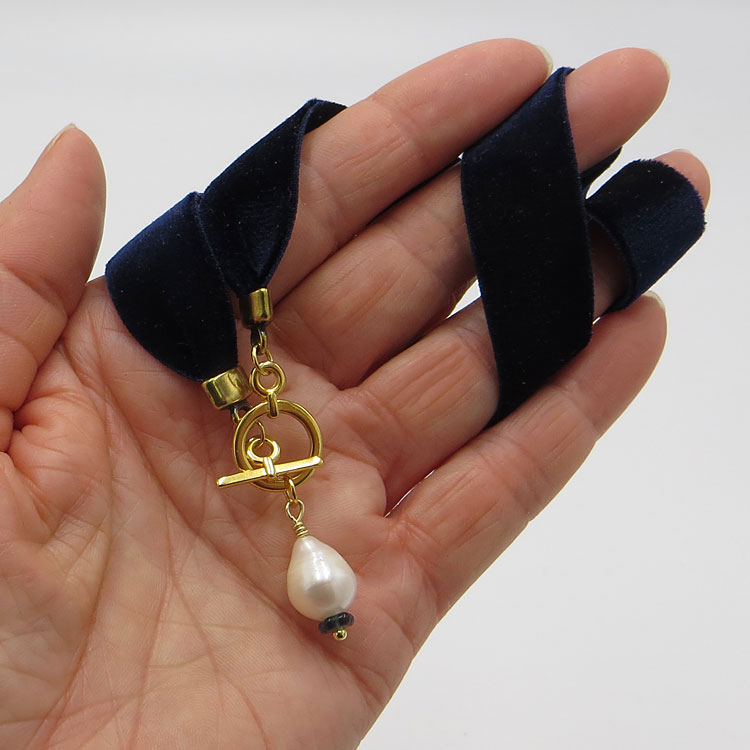 - Komponenten und Materialien: Samtband (ca. 15mm, je nach Farbwahl in elastischer bzw. nicht elastischer Bandqualität), Süßwasserperle*, Glasblüte, Stab-Ring-Verschluss/ Vorderverschluss aus Metall (vergoldet)