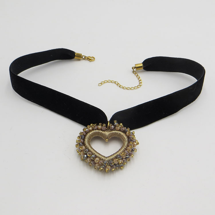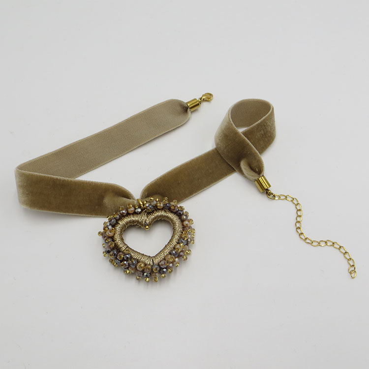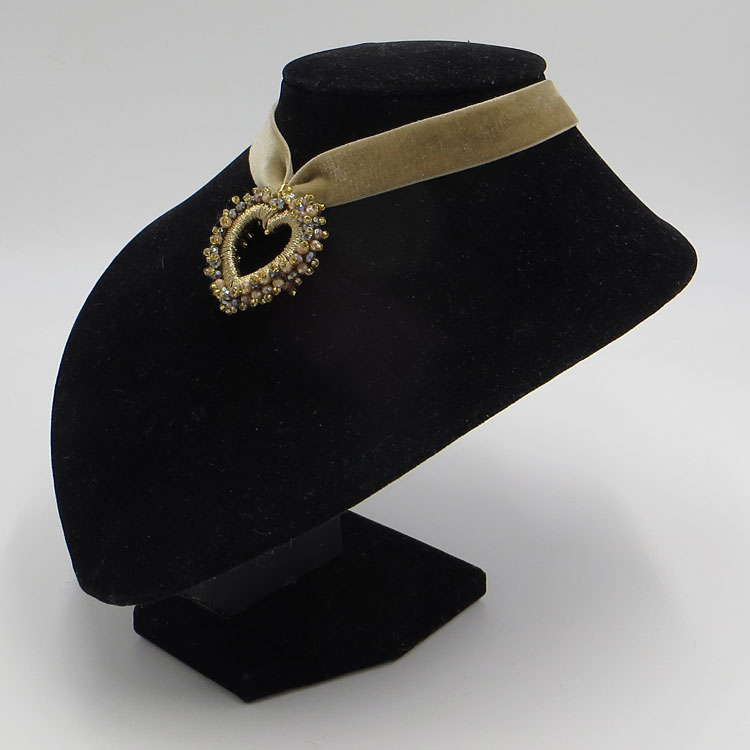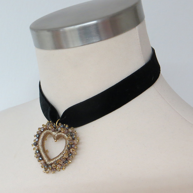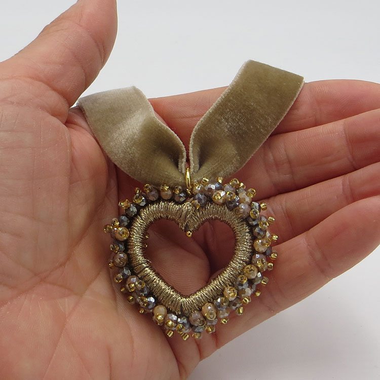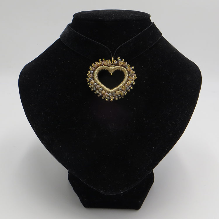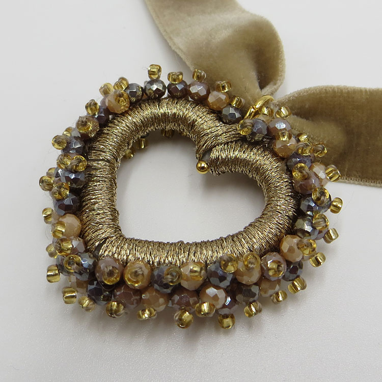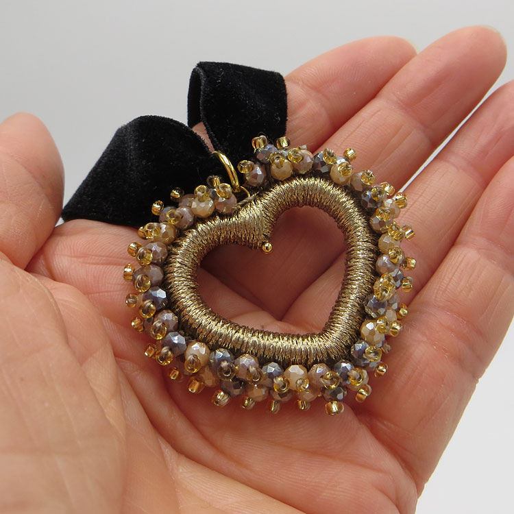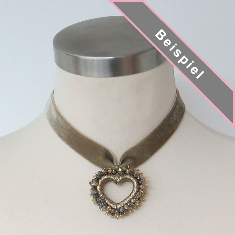 Das Perlenherz ist DER Blickfang an dieser sonst so schlichten Samt-Kette! Der Perlenumriss ist über und über mit kleinen, facettierten Glasperlen bestickt und mit goldfarbenem Glanzgern umwickelt.