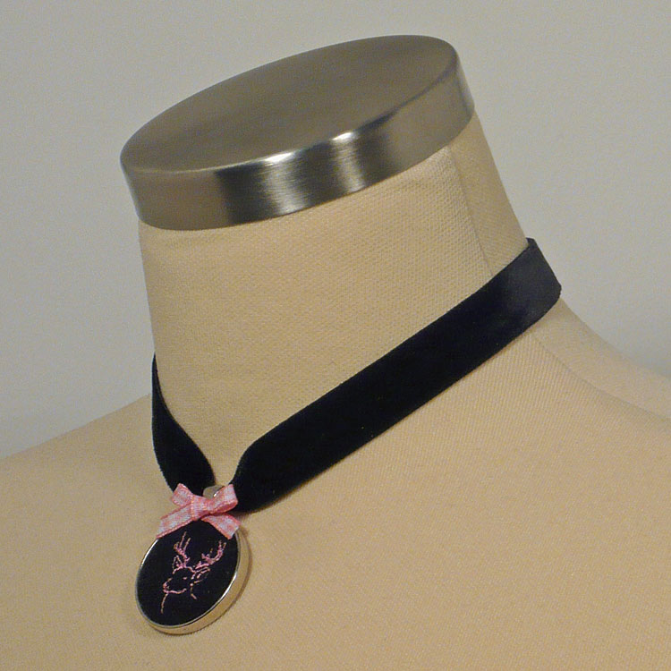 halsnahe Samtband-Kette, Hirsch-Medaillon (gestickt) mit kleiner Karoschleife