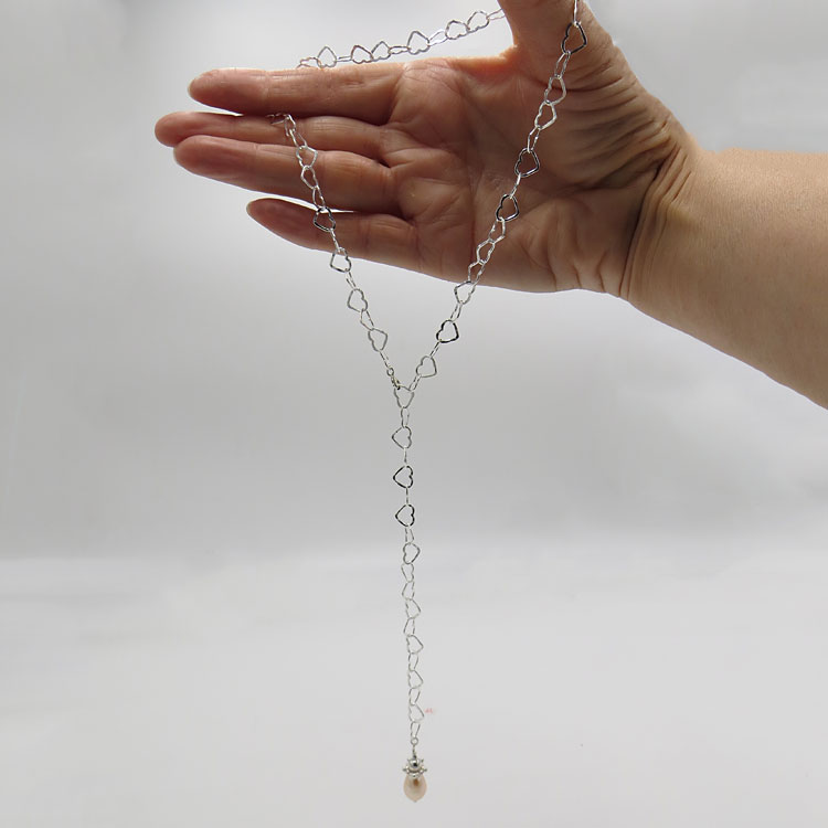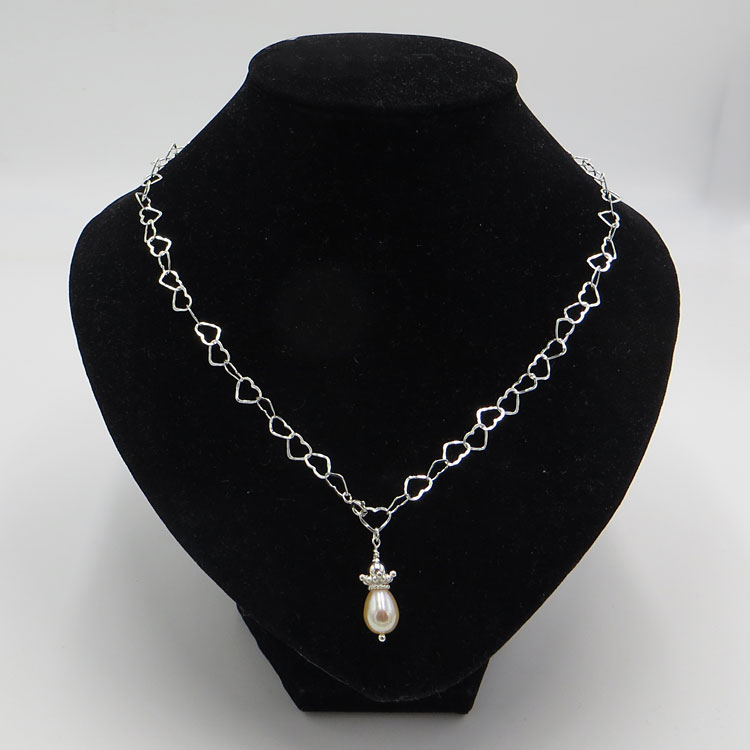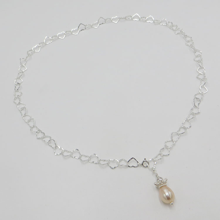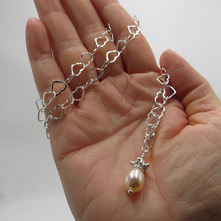 Die hochwertige Kette ist aus 925 Silber gearbeitet. Das Besondere sind die gehämmerten, herzförmigen Kettenglieder. Den Abschluss bildet ein wunderschöner Anhänger mit edler Süßwasserperle und einer kleinen Krone.